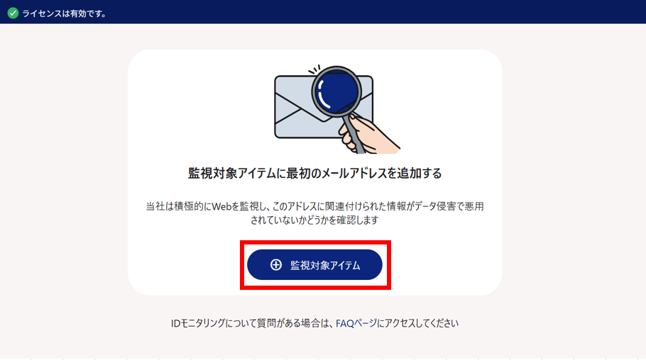 ユーザ管理ポータルのメニューの「セキュア・プライバシー(旧パスワードマネージャー)の監視」からモニタリング(監視)のキーとなるメールアドレスの登録とモニタリング(監視)の確認を行えます。モニタリング(監視)のキーとなるメールアドレスは、最大5つまで登録できます。